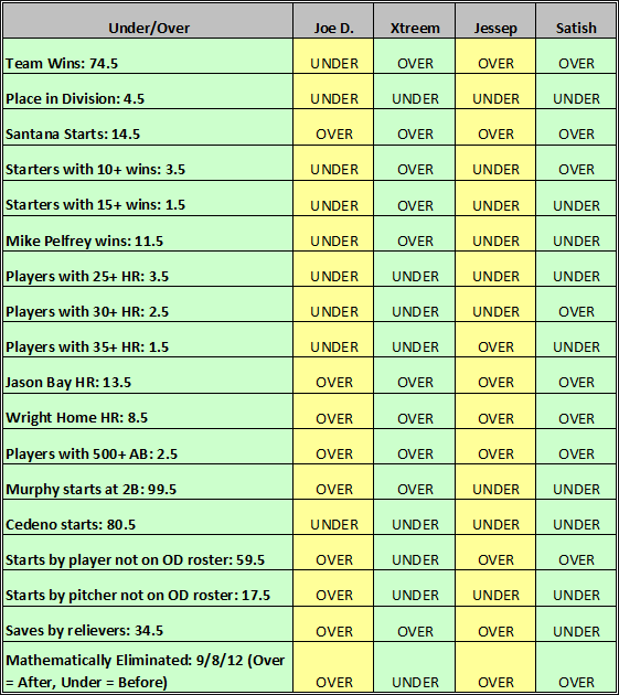 As the official proclamation came down from Sandy Alderson that the Mets are pretty much done making anymore additions, I thought we’d have some fun. Me and a few of the guys (XtreemIcon, Jessep and Satish) thought it would be cool to do an “Over and Under” for the 2012 season. Don’t worry, it’s not as bad as you would think, but the results were pretty varied and interesting to look at. Here’s what we came up with: