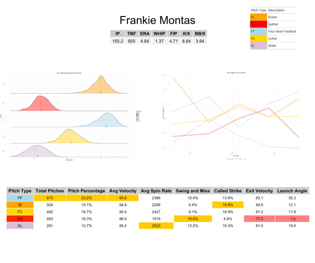 Montas utilizes a five-pitch arsenal consisting of a sinker, splitter, four-seam fastball, cutter, and slider. While he used his four-seamer the most at a 33.2% rate, what is most interesting is how he used the rest of his pitches. Montas had a pretty even distribution for the rest of his pitches, throwing his sinker at 19.1%, his cutter at 18.7%, his splitter at 18.3%, and his slider at 10.7%. This shows that Montas liked to use his repertoire against batters to keep them off-balance. As can be seen from the graph titled Pitch Usage in Last 5 Games, all of his pitches down the stretch were used, and all were usedbetween 15% – 35%. Another interesting statistic is that Montas whips his pitches when throwing. The average spin rate for all of his pitches, aside from his splitter, was over 2200 revolutions per minute.