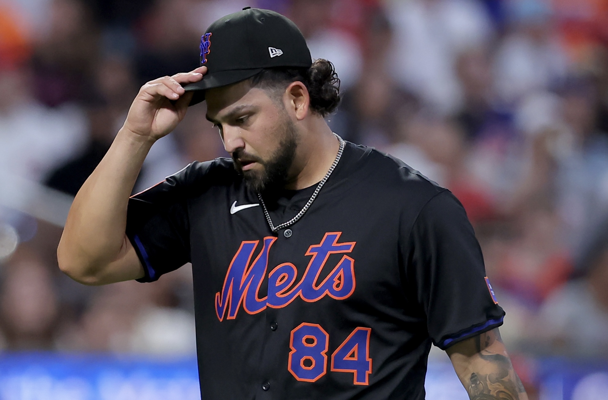 Jul 18, 2025; New York City, New York, USA; New York Mets relief pitcher Alejandro Carrillo (84) reacts during the fifth inning against the Cincinnati Reds at Citi Field. Mandatory Credit: Brad Penner-Imagn Images