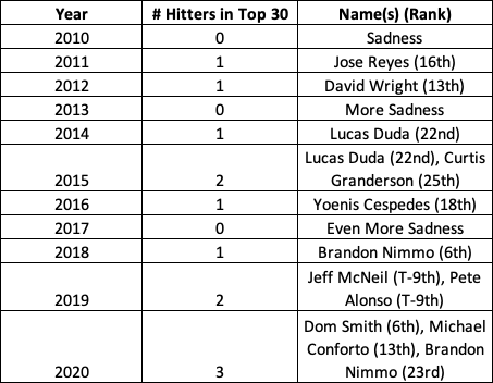 As it turns out, the 2020 occurrence was the first time it happened if we look back in Mets history to 2010. Here’s a quick rundown of how many qualified hitters found their way into the top 30 of FanGraphs’ wRC+ leaderboard and who they were.