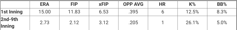 In the first inning this season, the right-hander has recorded a 21.6% LD rate, 32.4% GB rate, 45.9% FB rate, 35.3% HR/FB ratio and a 44.7% hard-hit rate against.