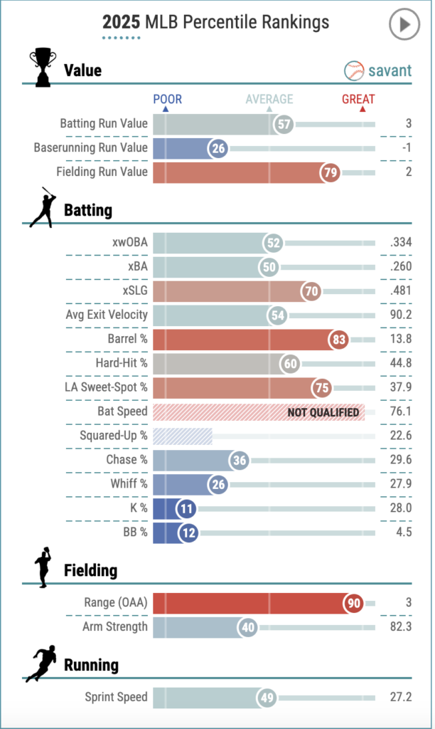 That’s not to say Baty is without flaws at the plate. His 28.0% strikeout rate and 4.5% walk rate both rank in the bottom 15% of the league, sitting in the 11th and 12th percentiles, respectively. While he’s posted better walk rates in prior seasons—9.4% in 2024 and 7.5% in 2023—he has never projected as a particularly patient hitter. Despite the swing-and-miss and limited plate discipline, Baty makes high-quality contact often enough to generate strong results when he does connect.