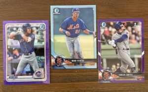 (L-R) Mark Vientos 2020 Bowman Chrome Prospects Purple Shimmer Refractor, Mark Vientos 2018 Bowman Draft Chrome Sky Blue Refractor, Carlos Cortes 2018 Bowman Draft Chrome Purple Refractor 123/250.