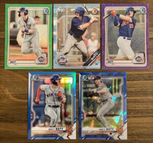 (clockwise top left) Brett Baty 2020 Bowman Chrome Prospects Green Refractor 19/99, 2019 Bowman Draft Sky Blue 281/499, 2020 Bowman Chrome Prospects Purple Mojo Refractor 147/250, 2021 Bowman Draft Chrome Sapphire Edition, 2021 Bowman Chrome Prospects Blue Shimmer Refractor 30/150.