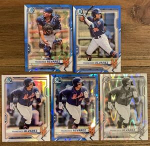 (clockwise top left) Francisco Alvarez 2021 Bowman Chrome Prospects Sapphire Edition, 2021 Bowman Chrome Prospects Blue Mojo Refractor 17/150, 2021 Bowman Chrome Draft Black &White Raywave Refractor, Bowman Draft Chrome Sapphire Edition, Bowman Draft Chrome Refractor.