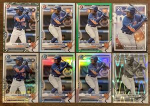 (clockwise top left) Ronny Mauricio 2021 Bowman Prospects Camo, 2021 Bowman Draft Sky Blue 131/499, Bowman Draft Green 19/99, 2021 Bowman Platinum Periodic Element, 2021 Bowman Draft Chrome Black & White Raywave Refractor, Bowman Draft Chrome Refractor, Bowman Draft Chrome Sky Blue Refractor, 2021 Bowman Chrome Prospects Mojo Refractor.