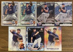 After undergoing Tommy John surgery last spring, pitching prospect Matthew Allan went under the knife again over the winter to transpose his ulnar collateral nerve. This procedure is common for pitchers that have had Tommy John surgery and is not expected to negatively impact his timeline to return to the mound. I found several new listings for Allan in March and capitalized by adding a few more of his cards to my collection.