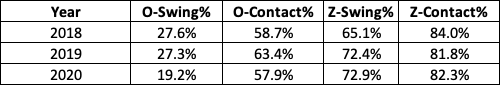 The 27-year-old has posted a solid .313/.411/.479 line with two home runs, six RBI, and a 156 wRC+ through 56 plate appearances. When looking at what he accomplished in 2019, a handful of areas have improved in the early going that have contributed to this.