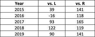 The 27-year-old’s offensive performance against left-handed pitchers hasn’t always been sunshine and rainbows, but that’s also partially because he wasn’t given as many chances as he should’ve received against them early in his career. Here’s a look at how his wRC+ against lefties and righties have progressed between 2015 and 2019.