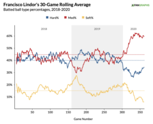 “Lindor’s 2018 was his best year, and since then he’s lost some of his discipline at the plate, chasing more breaking stuff at the edges of the zone and out of it, resulting in small hits to his walk and strikeout rates and OBPs well below his 2018 peak. There’s nothing in his batted-ball data to say he can’t hit as he did in 2018, and perhaps a new environment and better team will convince him to go back to his earlier, more patient approach.”