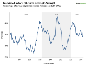 Count me among the people with little concern about the 2020 dip. Although he was chasing more pitches outside the zone, he wasn’t far off from his general levels over the past couple of years, and improved back to stable levels as the shortened season progressed:
