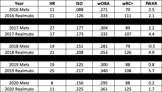 Just for funzies, here’s a side-by-side view of how Realmuto has performed compared to the Mets’ entire catching squad since that initial 2016 breakout: