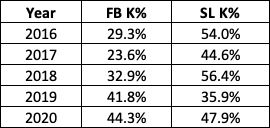 Here’s a look at how the strikeout rate for Diaz’s fastball and slider have progressed between 2016 and 2020:
