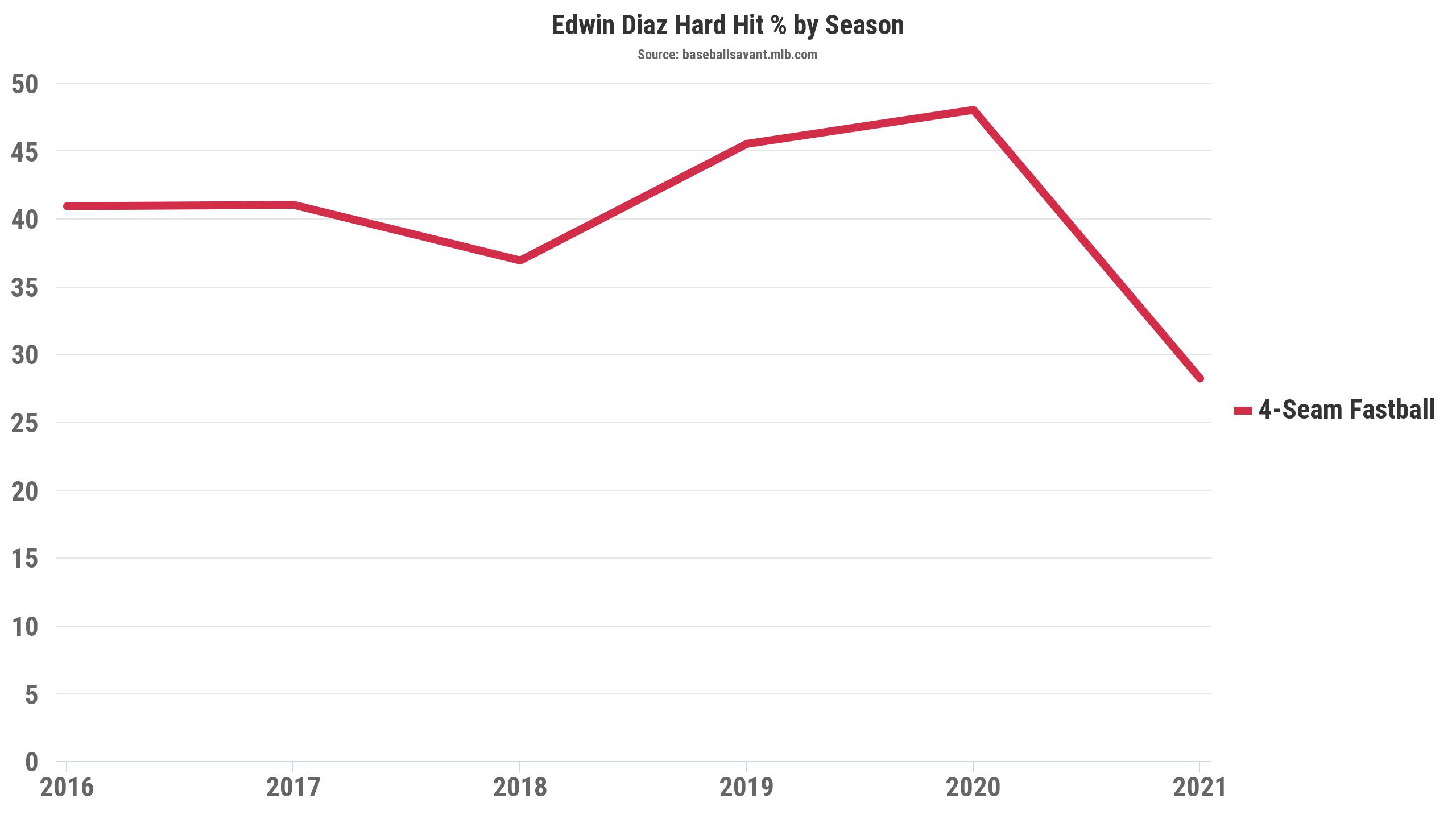 Unlike previous seasons, Diaz has solely relied on his high-90s fastball and low-90s slider in 2021, cutting out his high-90s sinker and mid-90s changeup from his arsenal. While his breaking ball has served as his primary strikeout weapon, his heater has played a crucial role in helping him reduce the amount of hard contact allowed.