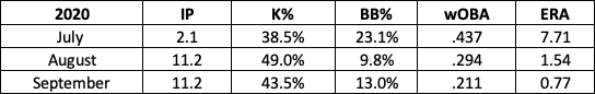 Here’s how his strikeout rate, walk rate, wOBA allowed, and ERA changed between July, August, and September.