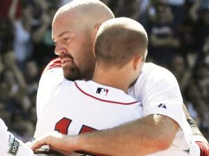 He was mobbed by teammates and even pushed out of the dugout for a curtain call by Red Sox manager Bobby Valentine. The Red Sox also played a video tribute to him.