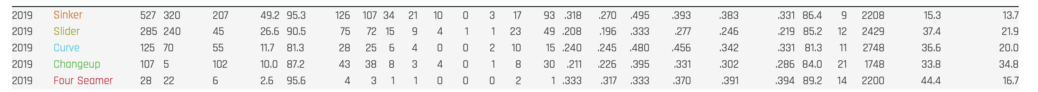 When batters are making contact, they’re not doing much against him in terms of exit velocity. He hasn’t allowed a gaudy launch angle either. His 2019 xwoBACON was .328, which was one of the best marks in the Majors.