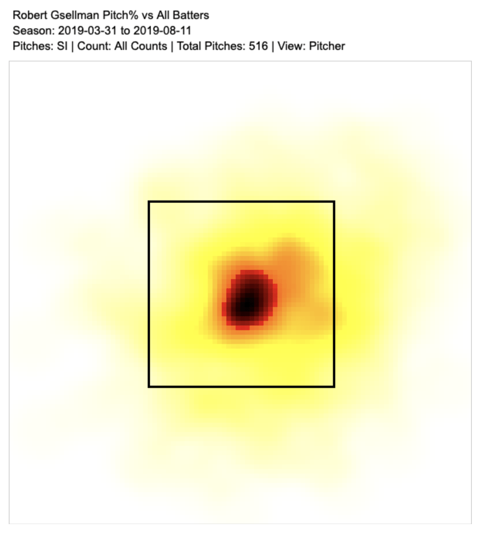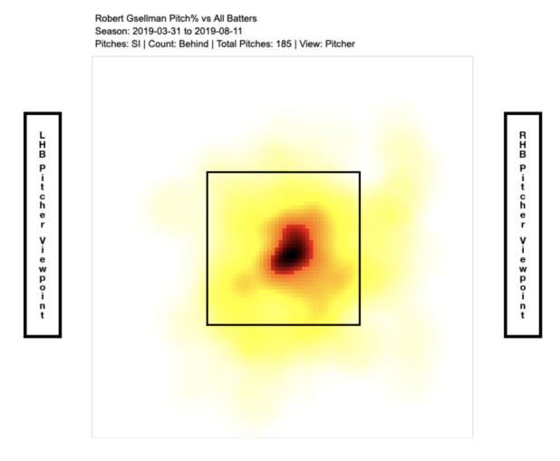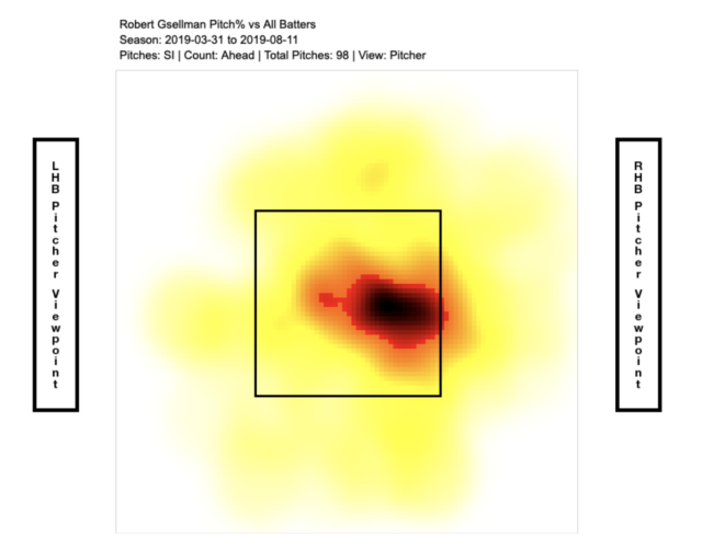 When Gsellman was ahead in the count, he located his sinker more towards the corners of the plate. However, as the count shifts towards the batter, it rose and moved left, right into the path of the batter’s swing. Fangraphs’s Heatmaps show us the movement of the delivery.