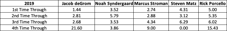It’s a good idea to mostly ignore the final row in the above table because the sample sizes are so small. Syndergaard was the only pitcher of these five to throw more than three innings in that situation, and he accumulated just over four frames himself.