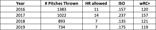 Although the wRC+ from opposing batters jumped from 98 to 118 between 2018 and 2019 for this specific offering, the right-hander’s strikeout rate went from 33.1% to 21.6% over the same period of time. There may have also been some trickle-down effect with his changeup — opponent wRC+ went from 98 to 158 over the past two seasons, along with a significant drop in strikeout rate (20.0% to 8.3%).