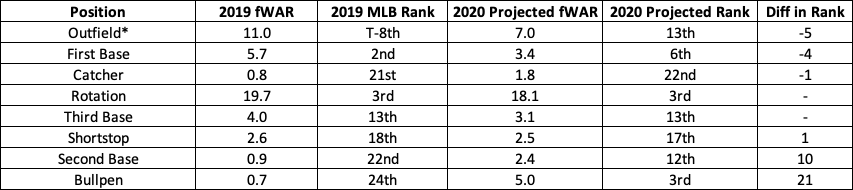 The below table summarizes all that, first recapping how each part of the roster performed in 2019 before comparing the 2020 projections from FanGraphs.
