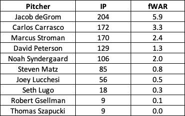 As one can imagine, the majority of the production is coming from deGrom, Carrasco, and Stroman. The projections get more interesting from there. The below table gives a glimpse of the projected workload and fWAR contribution from each listed on New York’s current rotation depth chart.