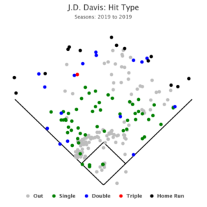 It’s really amazing the season Davis has put together in such a limited amount of playing time. In just 312 plate appearances, not only does J.D. have 14 bombs, but he’s also 83rd in the entire MLB in barrels with 25. For a batted ball to constitute as a “barrel,” it must have an exit velocity of 98 mph or higher while having a launch angle above 26 degrees. To put that stat in perspective, MVP candidate Ronald Acuna Jr. is second in the bigs with 53 barrels, in 553 plate appearances. Crazy, right? Also, J.D. is hitting the ball all over the diamond. Check out this spray chart.