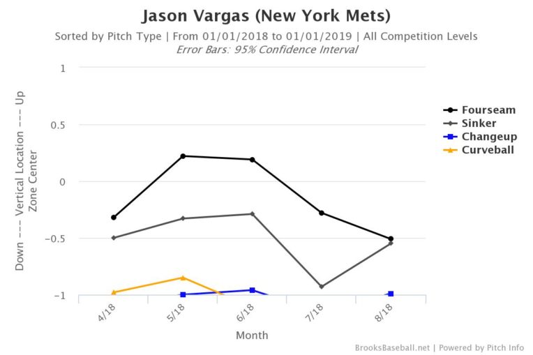There are a couple reasons for this shift. One is that he’s not living up in the strike zone nearly as much. The following graph shows how the vertical location of his pitches have changed throughout the year, courtesy of Brooks Baseball.