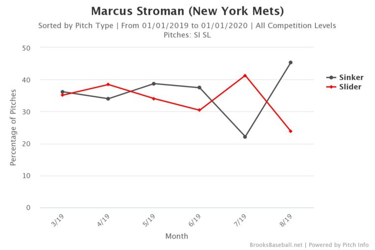 Stroman’s sinker is where he generates a ton of ground balls from (65.5% ground-ball rate so far in ’19), but it’s also the pitch that opposing hitters have produced the highest walk rate (11.8%) and second-highest wRC+ (121) among the offerings he’s tossed at least 100 times this year.
