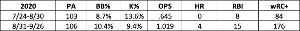 To put it simply, he never had a truly bad month if we use wRC+ as the measuring stick. Here’s how his month-by-month performance looked from the time he made his MLB debut in July of 2018, all the way through the end of the 2019 season.