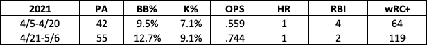He’s accomplished this by being aggressive in situations that make sense. His chase rate has consistently decreased, and his current 34.4% rate would be a new career-best mark if it can be sustained. Meanwhile, his swing rate on strikes has essentially remained the same since his debut (84.2% in ’18, 85.0% in ’19, 84.0% in ’20, 85.0% in ’21). That’s the kind of plate approach that will enable any hitter to experience some level of success by the end of every season.