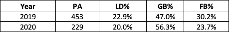 For a hitter who had previously struggled with hitting lots of ground balls, this is a trend nobody wanted to see tick back up in the wrong direction. When splitting up his shortened season into two abbreviated halves, it’s clear that most of this unfortunate damage came in the second half, as it went from 51.7% to 59.7% between these two periods of time.