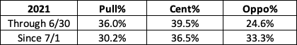 Naturally, I had to see what was going on. He wasn’t necessarily pulling everything through the end of June, but look at how the direction of his batted-ball events has changed when compared to one another: