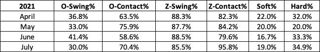 As it currently stands, his 33.3% chase rate and 85.8% swing rate on strikes would both be new single-season career-best marks. Check out the monthly progression of his swing rates, the corresponding contact rates, as well as his quality of contact during those times.
