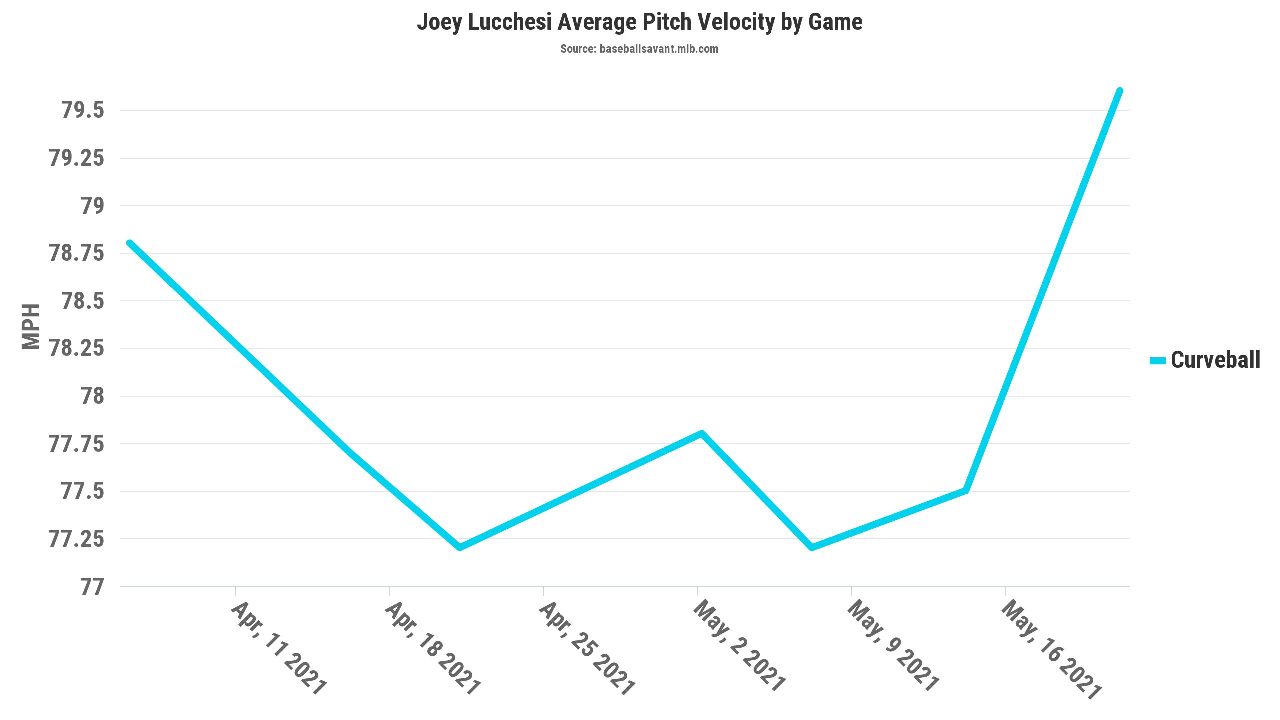 While Lucchesi didn’t make any mechanical adjustments before his latest start, he still witnessed a fairly dramatic increase in his breaking ball’s velocity, as it climbed from its average velocity of 77.5 mph on May 15 to a season-high 79.6 mph on May 22.