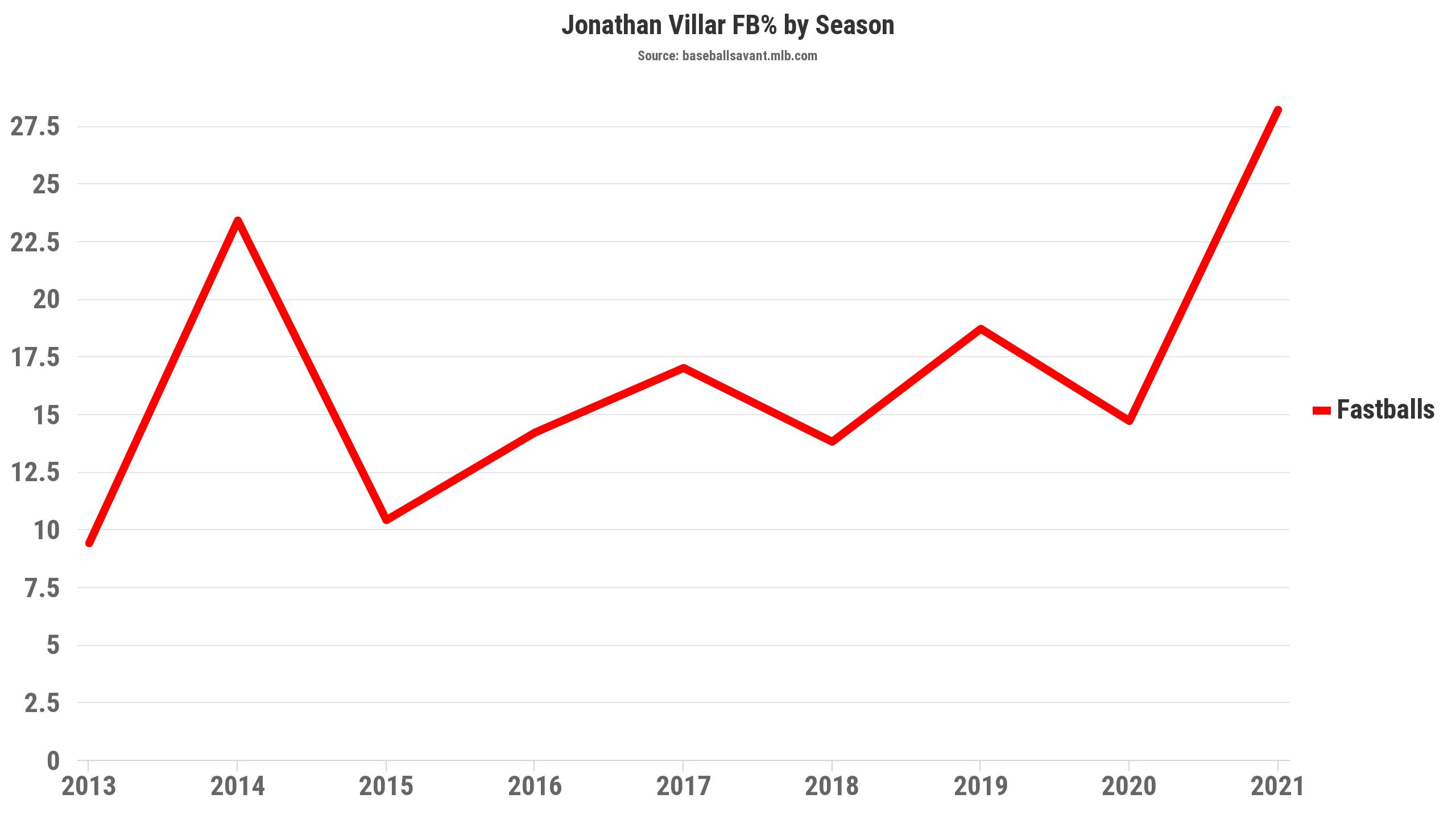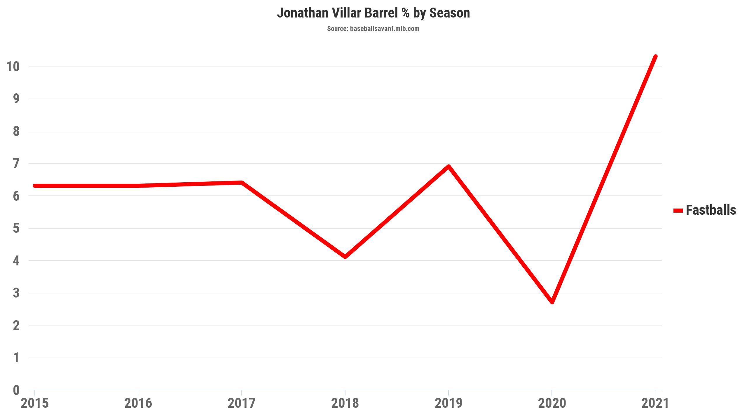 While Villar has struggled to hit for contact this season, resulting in his .279 BABIP, he’s been able to make an impact with his power and his impressive speed on the basepaths. Though he’s only generated a 26.2% hard-hit rate and an 85.9 mph average exit velocity, the switch-hitter is barreling up more balls and hitting them in the air much more frequently than he did throughout the shortened campaign.