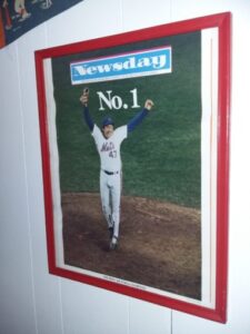 To further the pattern, we thought today this article would expand the topic and highlight Met’s wallhangings. The first wall hanging, shown below, is a framed back cover of Long Island Newsday from October 28, 1986 which was the day after the Mets won their last World Series.