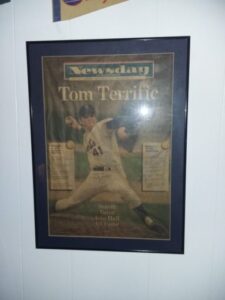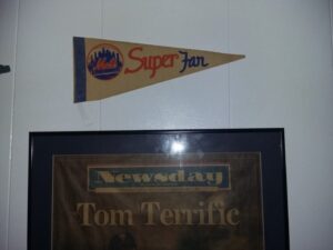 Just above the picture of Tom Terrific is a small pennant, no more than about 9 inches long announcing the author as a Mets Super Fan. This small pennant was a gift from the Mets back in the 1980s when the author signed up as a member of the Junior Mets fan club.