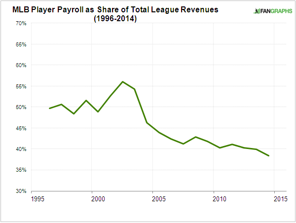Further evidence that the players have lost ground revenue-wise comes from FanGraphs shown below. The players are getting a smaller and smaller share of league revenues over time.
