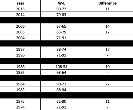 Of course, while making significant strides in overall record is never a bad thing, they’re not necessarily all created equal. The first thing I did was eliminate the significant improvements that were either a result of a strike-shortened season or if that improvement still ended with a losing record.