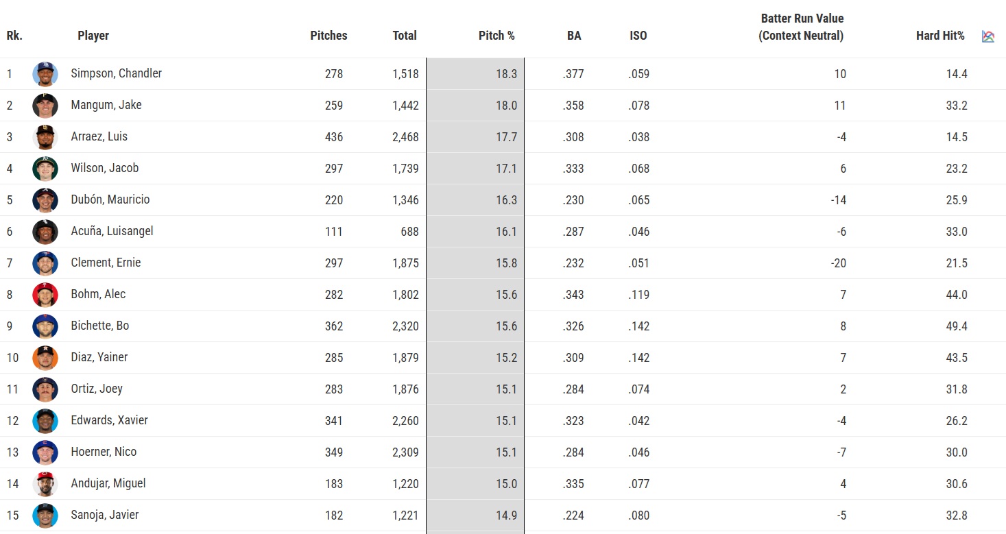 Bichette is one of the most unique hitters in baseball today. The vast majority of hitters who hit the ball to the opposite field and up the middle, ot the extent Bichette does, are what most would consider slap hitters. The image of Juan Pierre, Tony Womack, or a more contemporary player like Chandler Simpson comes to mind. Players whose game focuses on limiting strikeouts, putting the ball in play and speed. Bichette, on the other hand, while he hit the 9th most non-pulled balls in play, had by far the highest hard hit rate out of anyone in the top 15 non-pull-oriented hitters.