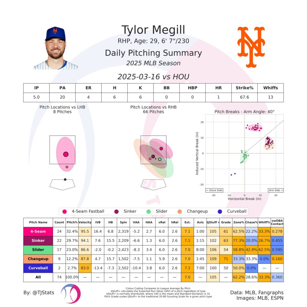 Megill faced a potent Houston lineup, which included the likes of Jose Altuve, Isaac Paredes and Yordan Alvarez. While Megill kept those hitters in check, he struggled against the middle to lower part of the order, giving up a home run to top prospect Cam Smith and a two-run single to Zach Dezenzo.