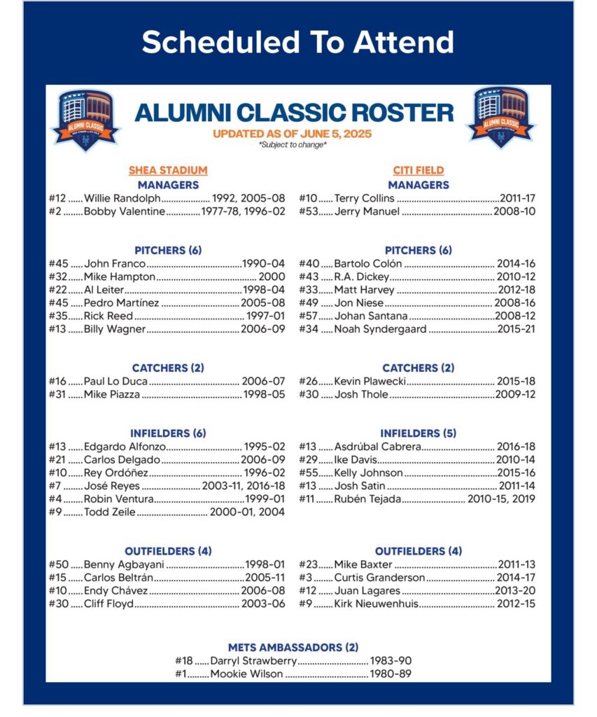 The three-inning game will take place prior to the 4:10 p.m. contest against the Texas Rangers. The rosters will be comprised of Amazin’ legends from the last decade of Shea Stadium and the first decade from Citi Field.