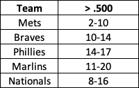 Having a softer schedule has obviously come with fewer opportunities to play teams with a record over .500. But in those limited chances, the Mets have struggled to a 2-10 record. Here’s how their record in this situation compares to the rest of the division: