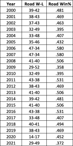 Just as I suspected, it’s uniquely terrible. Here’s a look at the Mets’ win-loss record and winning percentages each year on the road since 2000: