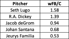 Right off the bat, it’s interesting to see two pitchers — Seth Lugo and R.A. Dickey — at the top of the fastball category despite not being particularly known for throwing the cheddar. This more pertains to Dickey because of his knuckleball, which obviously made a fastball in the low-to-mid 80s seem like it was going a million miles per hour.
