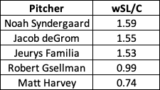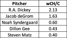 It’s tough having Dickey at the top here because he tossed his changeup at just a 1.0% clip. That’s also why pitch values on a per-100-pitch basis were used for this exercise — to even out the playing field when it came to usage. However, we can probably give the de facto crown to deGrom in this instance as he’s in his own league when it comes to changeup value in a Mets uniform recently.