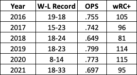 Did you know that the last time the Mets finished a season with a winning record against left-handed pitching was in 2016? It’s true. Offensive production has been a little all over the map, but none of it has led to a winning record in the last five years, with 2021 being the worst from the standpoint of winning percentage. Here’s a look at New York’s record against lefties in each of the past five seasons, along with the team OPS and wRC+ in that situation.