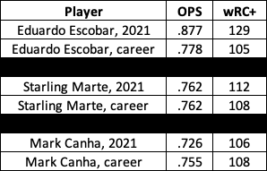 Sure, Marte and Canha are right-handed and Escobar is a switch-hitter, but can they actually hit left-handed pitching? That’s the key here, and they’ve each proven to be capable of doing so after looking at both their 2021 performance and overall career numbers.