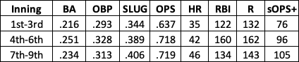 Some other important team offensive statistics back this up, too. The following numbers don’t include Wednesday’s game, but again, it’s not like including those numbers would help the Mets’ case here. Check out how they’ve performed at the plate between the first and third inning, between the fourth and sixth inning, and between the seventh and ninth inning: